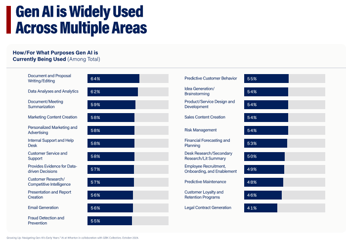 Sebbene la Gen AI venga percepita come significativa, è considerata "altamente impattante" solo in ambiti specifici, come l'IT, . Le principali applicazioni includono la scrittura e modifica di documenti, l'analisi dei dati e la sintesi di riunioni o documenti. Tuttavia, lo studio evidenzia che le performance migliori si registrano in ambiti come analisi dati, brainstorming, generazione di contratti legali, rilevamento di frodi e creazione di email.