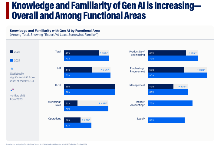 Il 72% dei decision maker utilizza Gen AI almeno una volta a settimana, rispetto al 37% del 2023. Un balzo notevole nonostante il passaggio dalla fase di “hype” iniziale a un approccio più mirato a dimostrare il ROI e valutare le performance concrete della tecnologia.Oggi, la Gen AI è impiegata in diverse funzioni aziendali come Marketing, Operazioni e HR, settori che nel 2023 erano ancora in ritardo, il grafico sotto mostra in dettaglio la crescita nei diversi dipartimenti aziendali.