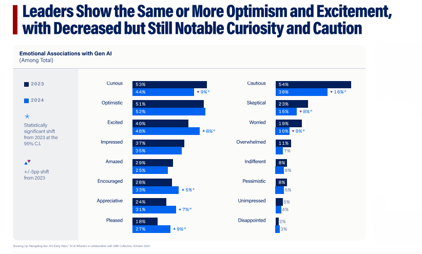 Con l'aumentare dell'esperienza pratica, anche le percezioni nei confronti della Gen AI sono cambiate. I decision maker si dichiarano sempre più "soddisfatti", "entusiasti" e "ottimisti" riguardo al suo potenziale. Le percezioni negative si stanno attenuando e cresce la fiducia nella capacità della Gen AI di potenziare i ruoli lavorativi anziché sostituirli. Interessante notare il calo dei sentimenti di "cautela" e "curiosità," un chiaro segnale che l’AI Generativa sta diventando parte integrante delle operazioni aziendali.