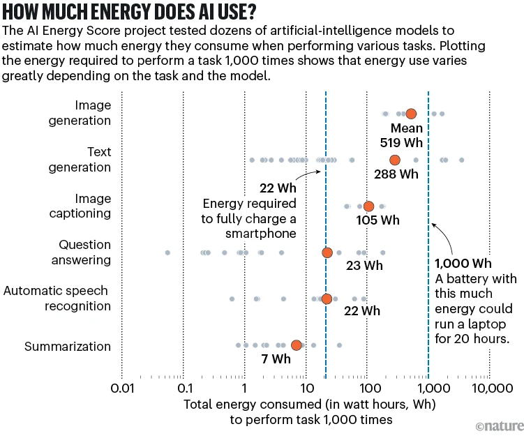 Luccioni e i suoi colleghi hanno osservato che il consumo energetico dei compiti di IA varia in modo significativo a seconda del tipo di attività. I loro risultati più recenti indicano che la creazione di un'immagine da un prompt di testo utilizza in genere circa 0,5 wattora di elettricità, mentre la generazione di testo tende a consumarne leggermente meno.