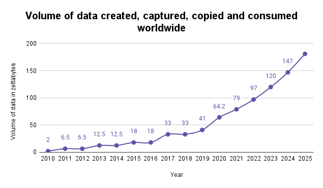La crescita esponenziale della creazione, del consumo e della duplicazione dei dati a livello mondiale negli ultimi anni è stata sbalorditiva. Statista ha previsto un volume colossale di dati creati ogni anno di oltre 180 zettabyte entro il 2025. La digitalizzazione ha ulteriormente alimentato questa espansione, creando un oceano di dati piene di informazioni preziose. Tuttavia, esiste un problema evidente, in quanto solo circa il 2% dei dati generati viene conservato, con una conseguente perdita di conoscenza e opportunità.